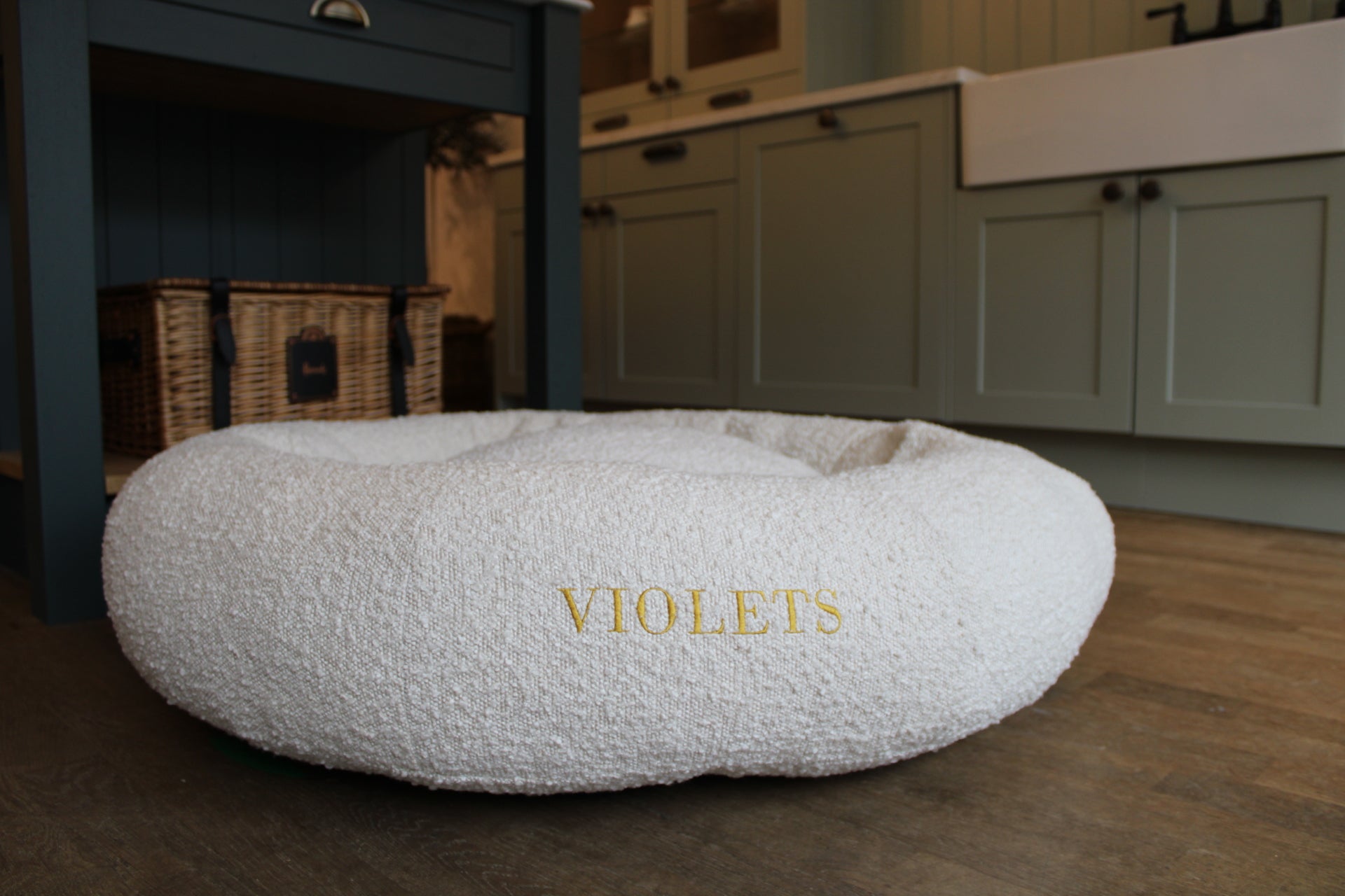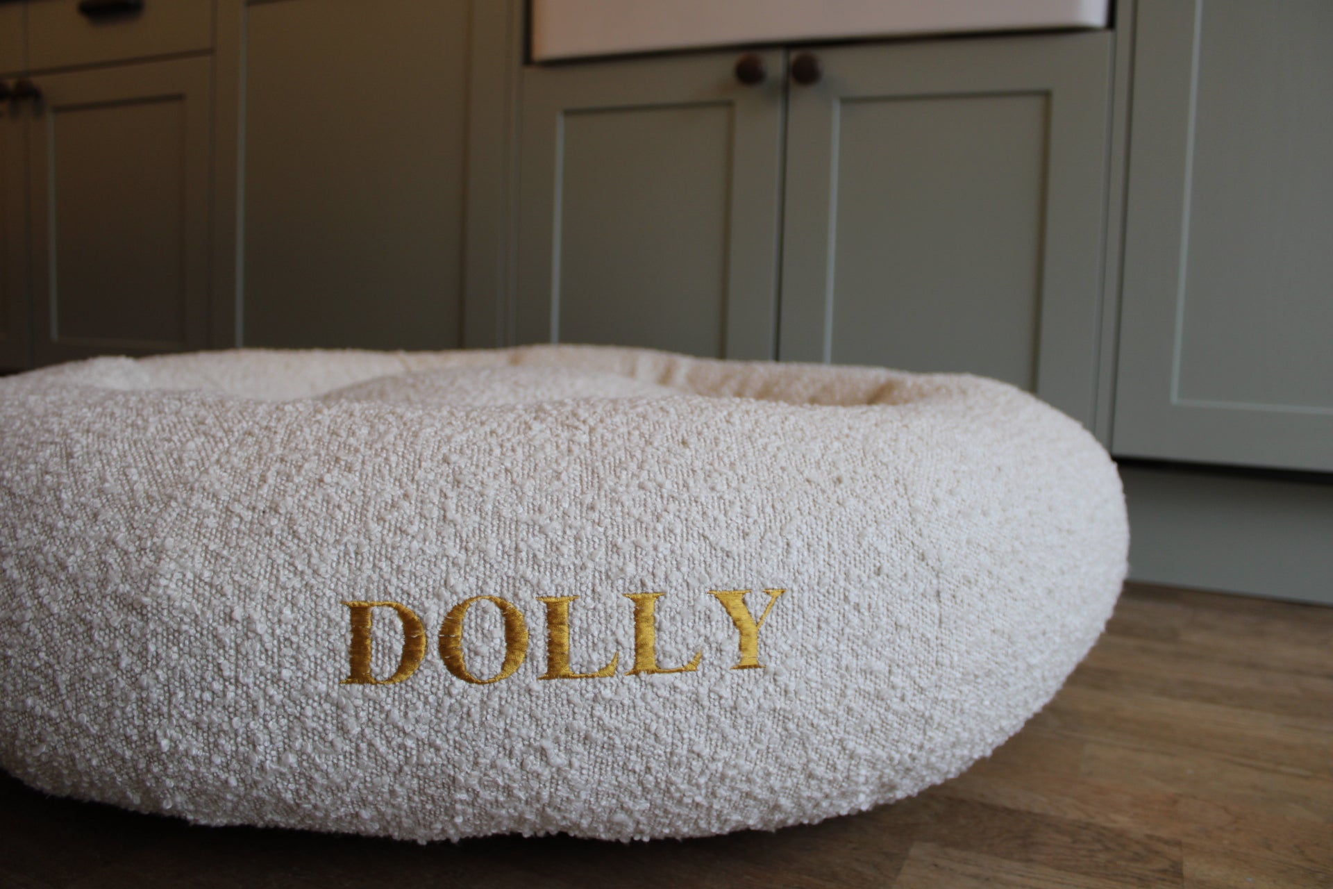 Personalised Oatmeal Circular Luxury Orthopaedic Personalised Bouclé Dog Bed